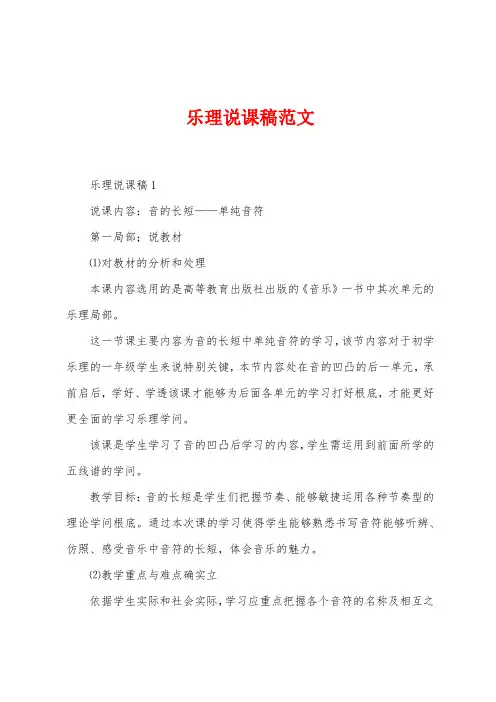 本文部分内容来自网络整理,本司不为其真实性负责,如有异议或侵权请及时联系,本司将立即删除!== 本文为word格式,下载后可方便编辑和修改! ==乐理说课教案篇一:音的长短乐理说课稿说课稿说课内容:音的长短——单纯音符第一部分;说教材⑴对教材的分析和处理本课内容选用的是高等教育出版社出版的《音乐》一书中第二单元的乐理部分。