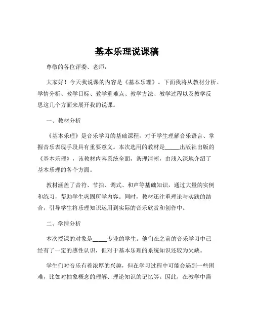基本乐理说课稿尊敬的各位评委、老师:大家好!今天我说课的内容是《基本乐理》。