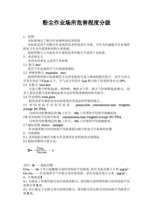 2.7超标倍数 excess multiple作业场所粉尘时间加权平均浓度超过粉尘职业卫生标准的倍数3、分级指标3.1 采用超标倍数作为粉尘作业场所危害程度的分级指标。