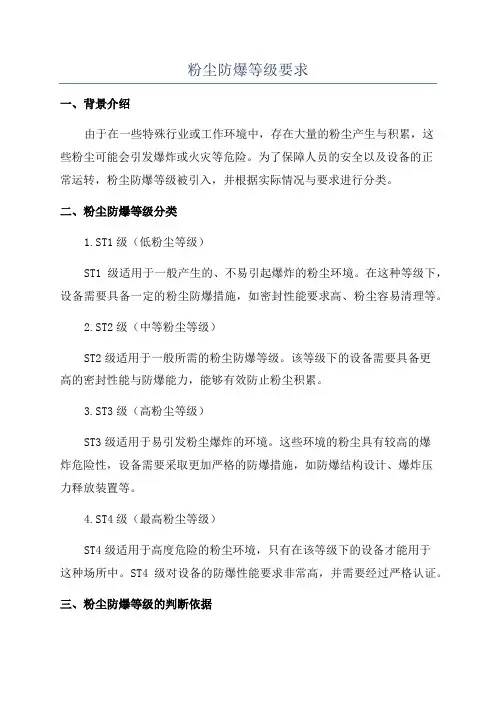 二、粉尘防爆等级分类1.ST1级(低粉尘等级)ST1级适用于一般产生的、不易引起爆炸的粉尘环境。