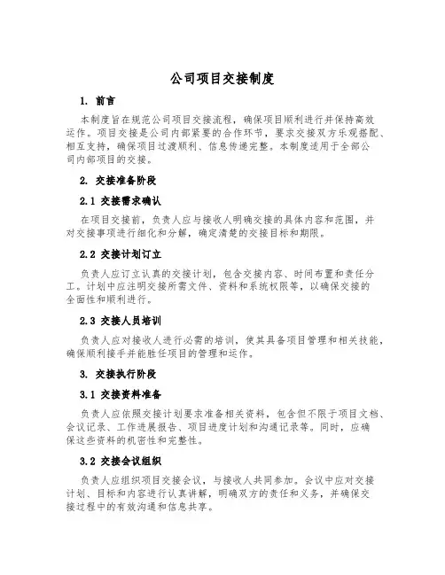 公司项目交接制度1. 前言本制度旨在规范公司项目交接流程,确保项目顺利进行并保持高效运作。