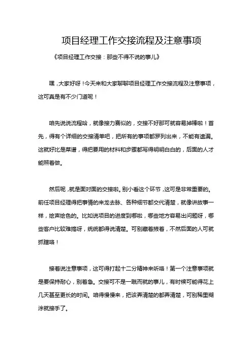 三、交接后支持3.1 跟踪项目发展:交接后,交接人员应当定期跟踪项目发展,确保项目按计划进行,及时发现和解决问题。