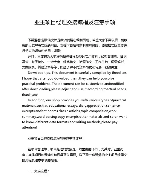 7. 交接事宜列出需要在交接过程中注意的事项,包括但不限于:- 安排交接时间和地点- 介绍现有团队成员的角色和职责- 详细说明交接过程中的各个环节和任务- 解答新的项目经理可能遇到的问题和疑虑- 提供相关联系人和支持确保新的项目经理能够从交接过程中获得必要的支持和指导。
