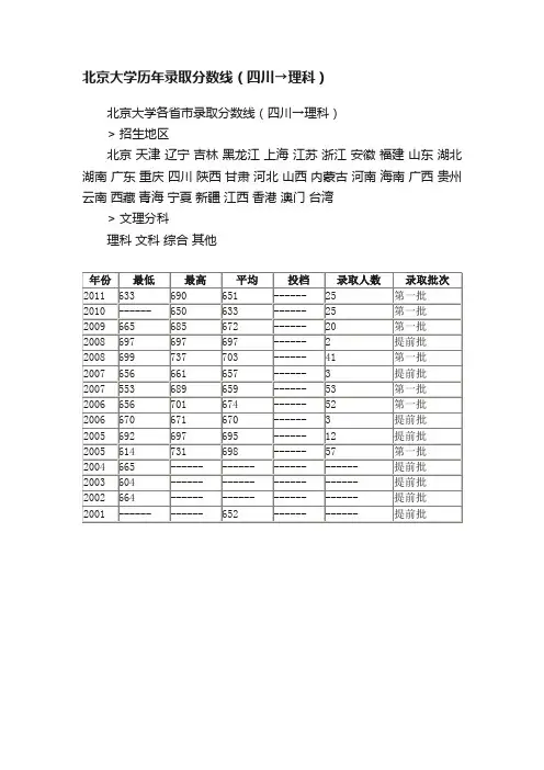 北京各大学录取分数线北京大学各省市录取分数线(北京→理科)年份最低最高平均投档录取人数录取批次2013 691 ------ ------691 ------ 第一批2012 654 702 660------ 150 第一批2011 655 690 662------ 144 第一批北京大学各省市录取分数线(北京→文科)年份最低最高平均投档录取人数录取批次2013 654 ------ ------654 ------ 第一批2012 615 670 622------ 83 第一批2011 634 675 645------ 79 第一批清华大学各省市录取分数线(北京→理科)年份最低最高平均投档录取人数录取批次2013 691 ------ ------691 ------ 第一批2012 656 712 659------ 210 第一批2011 651 696 666------ 239 第一批清华大学各省市录取分数线(北京→文科)年份最低最高平均投档录取人数录取批次2013 664 ------ ------664 ------ 第一批2012 619 630 ------------ 10 第一批2011 641 683 658------ 31 第一批中国人民大学各省市录取分数线(北京→理科)年份最低最高平均投档录取人数录取批次2013 660 ------ ------680 ------ 第一批2012 609 662 629------ 103 第一批2011 610 662 638------ 91 第一批中国人民大学各省市录取分数线(北京→文科)年份最低最高平均投档录取人数录取批次2013 623 ------ ------637 ------ 第一批2012 574 627 598------ 101 第一批2011 606 646 628------ 93 第一批2013 ------ ------ ------654 ------ 第一批2012 608 657 623------ 75 第一批2011 604 655 620------ 76 第一批北京师范大学各省市录取分数线(北京→文科)年份最低最高平均投档录取人数录取批次2013 ------ ------ ------636 ------ 第一批2012 578 617 590------ 41 第一批2011 599 631 609------ 42 第一批北京航天航空大学北京-理科年份最低最高平均投档录取人数录取批次2013 657 ------ ------657 ------ 第一批2012 609 662 624------ 262 第一批2011 602 670 617------ 247 第一批年份最低最高平均投档录取人数录取批次2013 607 ------ ------607 ------ 第一批2012 525 594 556------ 25 第一批2011 591 628 600------ 25 第一批北京理工大学北京-理科年份最低最高平均投档录取人数录取批次2013 ------ ------ ------638 ------ 第一批2012 573 653 610------ 277 第一批2011 583 649 604------ 282 第一批北京理工大学北京-文科年份最低最高平均投档录取人数录取批次2013 ------ ------ ------638 ------ 第一批2012 573 653 610------ 277 第一批2011 583 649 604------ 282 第一批中国农业大学北京-理科年份最低最高平均投档录取人数录取批次2013 626 ------ ------------ ------ 第一批2012 565 644 576------ 230 第一批2011 562 644 574------ 239 第一批中国农业大学北京-文科年份最低最高平均投档录取人数录取批次2013 603 ------ ------------ ------ 第一批中央民族大学北京-理科年份最低最高平均投档录取人数录取批次2013 ------ ------ ------585 ------ 第一批2012 494 629 545------ 45 第一批2011 535 580 546------ 35 第一批年份最低最高平均投档录取人数录取批次2013 ------ ------ ------564 ------ 第一批2012 532 570 538------ 24 第一批2011 567 610 569------ 36 第一批北京交通大学北京-理科年份最低最高平均投档录取人数录取批次2013 630 ------ ------630 ------ 第一批2012 575 652 595------ 201 第一批2011 561 650 591------ 216 第一批北京交通大学北京-文科年份最低最高平均投档录取人数录取批次2013 611 ------ ------------ ------ 第一批2012 560 579 563------ 17 第一批2011 571 616 580------ 19 第一批北京工业大学北京-理科年份最低最高平均投档录取人数录取批次2013 575 ------ ------575 ------ 第一批2012 516 654 536------ 1766 第一批2011 515 648 538------ 1716 第一批北京工业大学北京-文科年份最低最高平均投档录取人数录取批次2013 574 ------ ------574 ------ 第一批2012 505 599 523------ 191 第一批2011 528 602 549------ 209 第一批北京科技大学北京-理科年份最低最高平均投档录取人数录取批次2013 620 ------ ------620 ------ 第一批2012 548 652 585------ 243 第一批2011 544 653 580------ 276 第一批北京科技大学北京-文科2013 577 ------ ------------ 158 第一批2012 514 634 563------ 151 第一批2011 525 648 563------ 153 第一批北京化工大学北京-文科年份最低最高平均投档录取人数录取批次2012 314 ------ ------------ ------ 第一批2011 335 ------ ------------ ------ 第一批北京邮电大学北京-理科年份最低最高平均投档录取人数录取批次2013 641 ------ ------641 ------ 第一批2012 535 648 592------ 330 第一批2011 547 649 598------ 333 第一批北京邮电大学北京-文科年份最低最高平均投档录取人数录取批次2013 587 ------ ------587 ------ 第一批2012 545 563 552------ 10 第一批2011 549 596 568------ 10 第一批北京林业大学北京-理科年份最低最高平均投档录取人数录取批次2013 606 ------ ------606 ------ 第一批2012 514 638 561------ 238 第一批2011 512 648 560------ 249 第一批北京林业大学北京-文科年份最低最高平均投档录取人数录取批次2013 567 ------ ------567 ------ 第一批2012 496 588 533------ 40 第一批2011 547 622 574------ 48 第一批北京协和医学院北京-理科年份最低最高平均投档录取人数录取批次2013 559 ------ ------------ ------ 第一批2012 497 571 531------ 25 第一批2011 514 562 536------ 25 第一批北京外国语大学北京-理科2013 632 678 ------------ ------ 第一批2012 557 613 582------ 32 第一批2011 545 638 601------ 31 第一批中央财经大学北京-理科年份最低最高平均投档录取人数录取批次2013 647 693 ------------ ------ 第一批2012 586 660 616------ 193 第一批2011 578 662 613------ 195 第一批中央财经大学北京-文科年份最低最高平均投档录取人数录取批次2013 614 666 ------------ ------ 第一批2012 547 611 572------ 72 第