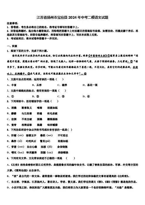 江苏省扬州市宝应县2024年中考二模语文试题注意事项:1.答卷前,考生务必将自己的姓名、准考证号填写在答题卡上。