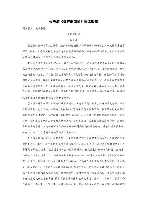 (取材于朱光潜《诗论》)材料二朗诵就是用洪亮清晰的声音和多种语言手段表达作品思想感情的一种语言艺术,也就是文字作品的“无声化有声”的一种创作活动,通过把文字作品用声音的高低变化和不同节奏表达出来,使作者的思想感情和作品的审美价值得以外化。