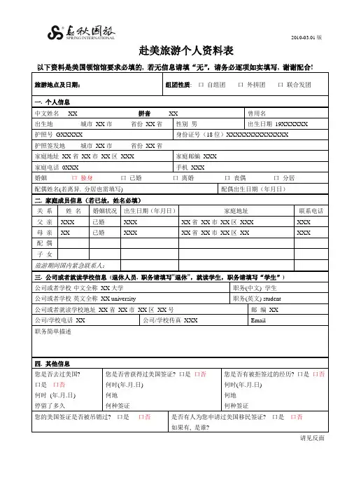 出访经历与所持护照种类无关)四、本次出访信息(此项如团组成员的信息一致,可只由团长一人填写)1、赴申请签证国的交通方式(交通工具) 航班号(车次/船次)2、赴申请签证国的酒店信息(填写进入该国第一个酒店的信息;申请多国签证时,填写每个申请国第一个酒店信息;申请申根签证时,只填主办国酒店信息;赴日本不在本栏填写)(*英文填写):第一国酒店名称电话第一国酒店地址第二国酒店名称电话第二国酒店地址3、邀请人信息(*此项除赴日、韩不在本栏填写,其余均须用英文填写,必须清晰可辨)邀请人姓名电话传真邀请人地址邀请人国籍电子邮箱(*以上信息应与邀请信一致)五、根据出访国所需补充信息1、申请韩国签证请提供:以前出入韩国时是否使用过其他姓名?如是,请填曾用名是否拥有双重国籍?如有,请说明是否有其他的护照?如有,请提供护照号码护照种类签发国护照有效期至年月日国内紧急联系人信息:姓名居住国家电话号码关系最终学历:博士或硕士□/ 学士□/ 高中□/ 其他□(请选项,其他学历请详细说明) 最终学校名称学校地址五年内访问过韩国的次数最后一次访韩详细目的韩国邀请人姓名出生日期或邀请单位营业执照号码2、赴日本签证请提供:拟入住酒店名称电话酒店地址日方担保人日文姓名英文姓名(同其护照) 性别国籍出生日期(公历) 年月日,职业和职务电话日文地址(以上所填内容应与邀请信一致) 英文地址3、申请申根签证请填写:过去三年内是否申请过申根签证(无论持何种护照)?是否如是,请写明最后3次申根签证有效及失效日期(从后往前写):①年月日至年月日②年月日至年月日③年月日至年月日*以往申请申根签证是否留取过指纹?是否如是,请写明最后一次留取指纹的具体日期年月日4、申请德国长期签证请填写:如已婚,请填写结婚日期年月日;如离异,请填写离婚日期年月日;如丧偶,请填写丧偶日期年月日父母住址(如不同,请分别填写) (*以下请用英文填写)列出最后五次在德国居留起、止时间(月/年)和当时居留城市的英文名称:拟在德居住地:路名和号码邮编和城市在德居住条件:单间□/ 公寓□/ 合住□/ 其他□(如公寓,室公寓;如其他请说明) 如工作,工作内容目前的专业及职业5、申请葡萄牙签证:赴葡途经的国家(英文)城市(英文)在葡酒店名称酒店中文地址英文地址6、申请爱尔兰签证:在本国居住年限年月,在本单位工作年限年月此次出访,是否有配偶或孩子同行?是否。