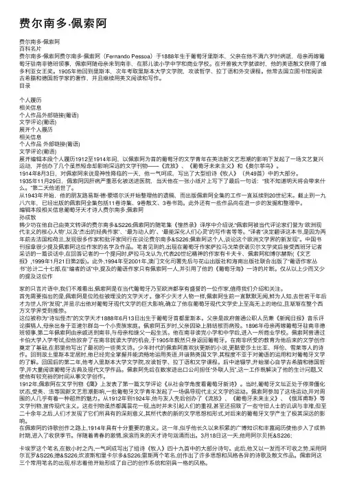 费尔南多·佩索阿费尔南多·佩索阿百科名⽚费尔南多·佩索阿费尔南多·佩索阿(Fernando Pessoa)于1888年⽣于葡萄⽛⾥斯本,⽗亲在他不满六岁时病逝,母亲再嫁葡萄⽛驻南⾮德班领事,佩索阿随母亲来到南⾮,在那⼉读⼩学中学和商业学校。