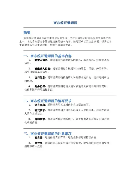 本文将介绍南非签证邀请函的基本内容、编写要求以及注意事项,帮助读者更好地准备签证申请材料,顺利办理南非签证。