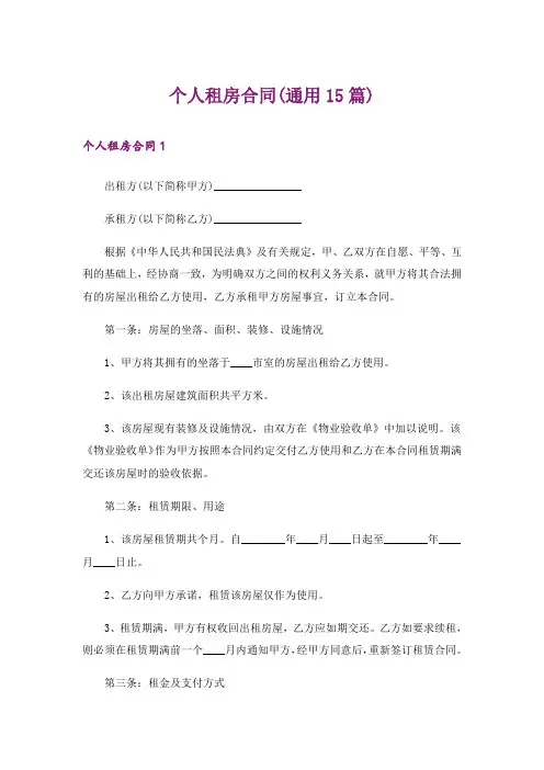 个人租房合同(通用15篇)个人租房合同1出租方(以下简称甲方)________________承租方(以下简称乙方)________________根据《中华人民共和国民法典》及有关规定,甲、乙双方在自愿、平等、互利的基础上,经协商一致,为明确双方之间的权利义务关系,就甲方将其合法拥有的房屋出租给乙方使用,乙方承租甲方房屋事宜,订立本合同。