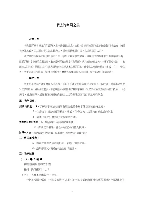 书法的点画之美一、教材分析本课属于“欣赏·评述”学习领域,第一课时通过欣赏、比较、分析等方式让学生着重感受汉字书法的点画特点及美感,第二课时学生以实践为主,重点尝试体验对汉字书法点画的认识。