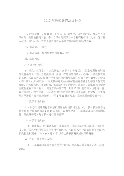 2017年教师暑假培训计划一、时间安排:7月11日---8月15日。