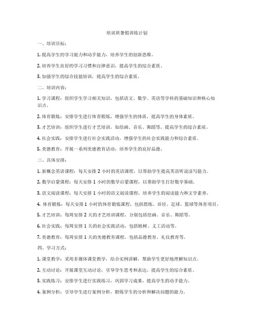 培训班暑假训练计划一、培训目标:1. 提高学生的学习能力和动手能力,培养学生的创新思维。