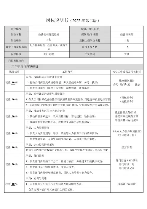岗位说明书(2022年第二版)岗位编号编制、修订日期岗位名称经营管理部副经理所属部门/项目 经营管理部岗位编制1名直接上级岗位名称1名直接下级岗位名称 人力资源经理、经管专员、法务专员直接下级人数3人行政职级部门副职工资序列管理岗位发展方向一、工作职责与内容描述职责权重工作内容核心工作成果及考核指标权重10 % 职责:战略目标与年度计划管理战略规划报告公司/部门年度BSC报表1)协助公司高层完成战略规划,并负责战略分解、传达、执行;2)负责公司和部门年度目标规划、调整修订、监督落实。
