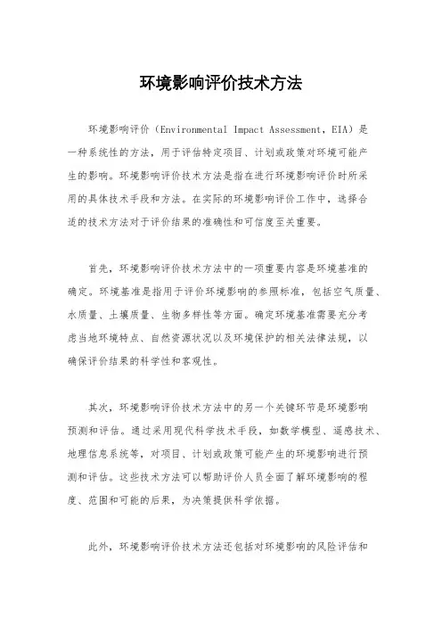 环境影响评价技术方法环境影响评价(Environmental Impact Assessment,EIA)是一种系统的、综合性的、前瞻性的环境管理工具,旨在评价特定项目对环境可能产生的影响,以便在项目实施前就采取必要的措施,以减轻或消除这些影响。