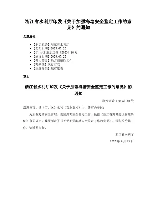 浙江省海塘工程安全评价技术大纲(试行)浙江省水利厅二○○九年四月目录1 总则 (1)2 评价程序 (2)3 工程质量复核 (2)4 防潮标准复核 (3)5 结构稳定复核 (4)6 渗流安全复核 (5)7 交叉建筑物安全影响复核 (5)8 运行管理评价 (5)9 总体安全评价 (6)附录:海塘工程现场安全检查内容 (9)条文说明 (10)浙江省海塘工程安全评价技术大纲(试行)1 总则1.1 为做好全省海塘工程安全鉴定工作,规范安全鉴定的工作内容、方法及评价标准,根据《浙江省海塘建设管理条例》、《浙江省钱塘江管理条例》、水利部《海堤工程设计规范》(SL4352008,以下简称《设计规范》)、《浙江省海塘工程技术规定》(浙水管〔1999〕56 号,以下简称《技术规定》)和《浙江省海塘工程安全鉴定管理办法》等有关要求,结合我省实际情况,制定本大纲。