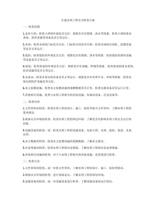 在建水利工程安全检查方案一、检查范围1.水库大坝:检查大坝的外观是否完好,观察是否有裂缝、渗水等现象。