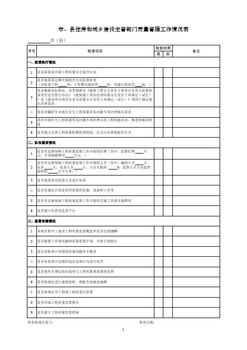 5贯彻落实住房城乡建设部关于印发工程质量安全手册(试行)的通知(建质﹝2018﹞95号)6是否根据本地实际,制定本地区建筑施工全生产大检查实施方案7是否开展房屋建筑和市政工程施工安全风险隐患双重预防体系建设体系二、队伍建设情况1监督工作经费(万元)2监督人员情况编制人员 人,实有 人,其中监督人员 人,占实有人数 %;监督面积共 万平方米,人均监督面积 万平方米3监督执法车辆(辆)4是否按要求对安全监督人员开展培训5是否建立信息化监管平台三、监督执法情况(2018年以来)1本地区新开工房屋市政工程安全监督覆盖率是否达到100%2是否根据工作情况编写安全监督计划,并按计划执行3对执法检查中发现的违规违规行为查处情况责令整改 起,罚款 万元,暂扣或吊销安全生产许可证个,暂扣或吊销“三类人员”考核证书 个4是否按有关规定及时上报事故情况5对生产安全事故责任单位和责任人查处情况(事故起数 起)罚款 万元,暂扣或吊销安全生产许可证 个,暂扣或吊销“三类人员”考核证书 个检查组成员签字: 检查日期:受检工程安全监督情况表项目名称(单体):形象进度:施工安全监督机构名称: 监督检查次数:序 号检查项目检查结果备 注是否1是否根据有关规定办理施工安全监督手续2是否编制项目监督计划3是否按监督计划实施4是否有完整的安全监督记录5是否对发现的安全问题和隐患责令整改6是否对发现的违法违规行为进行处罚7是否开展安全生产标准化考评8是否开展安全生产隐患排查和专项整治9是否将危险性较大的分部分项工程施工安全要点悬挂在显著位置10是否开展房屋建筑和市政工程施工安全风险隐患双重预防体系建设体系10监督情况描述(包括但不限于下述内容:受检工程安全监督手续、监督计划等资料是否完善,安全监督履职情况,受检工程安全监督档案情况。