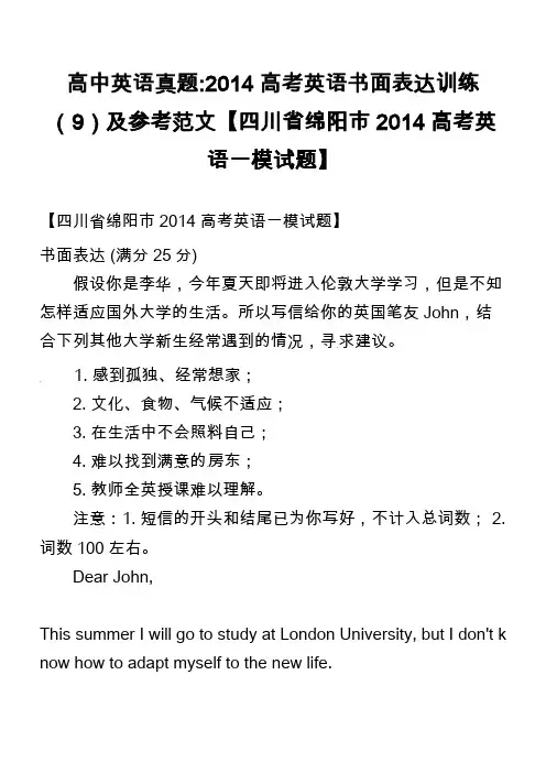 高中英语真题:2014高考英语书面表达训练(9)及参考范文【四川省绵阳市2014高考英语一模试题】【四川省绵阳市2014高考英语一模试题】书面表达 (满分25分)假设你是李华,今年夏天即将进入伦敦大学学习,但是不知怎样适应国外大学的生活。