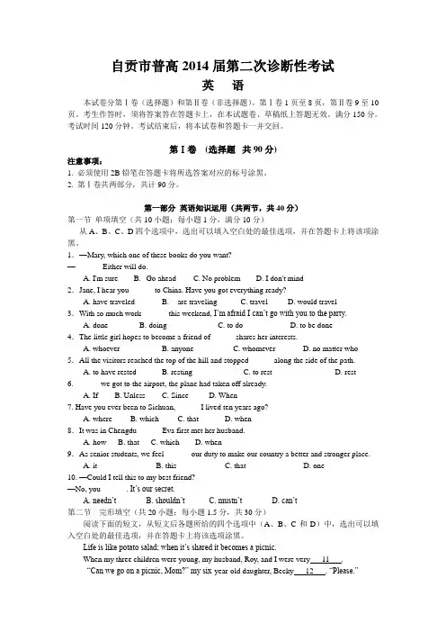 自贡市普高2014届第二次诊断性考试英语本试卷分第Ⅰ卷(选择题)和第Ⅱ卷(非选择题)。