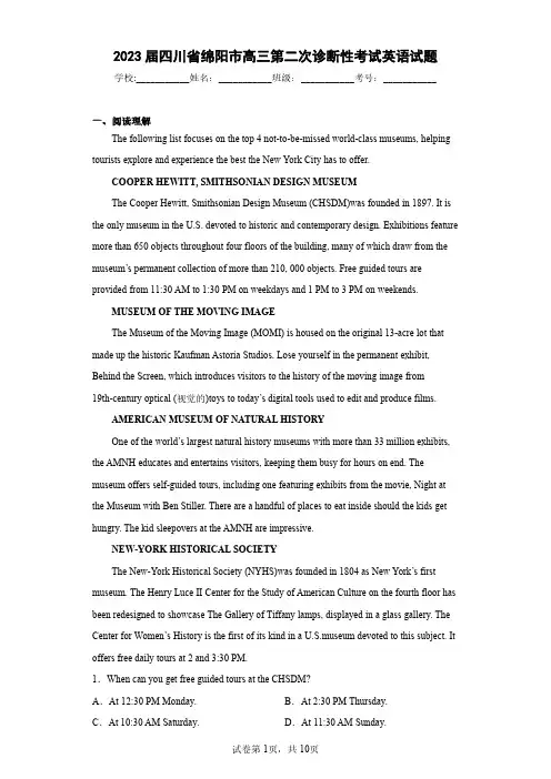 2023届四川省绵阳市高三第二次诊断性考试英语试题学校:___________姓名:___________班级:___________考号:___________一、阅读理解The following list focuses on the top4not-to-be-missed world-class museums,helping tourists explore and experience the best the New York City has to offer.COOPER HEWITT,SMITHSONIAN DESIGN MUSEUMThe Cooper Hewitt,Smithsonian Design Museum(CHSDM)was founded in1897.It is the only museum in the U.S.devoted to historic and contemporary design.Exhibitions feature more than650objects throughout four floors of the building,many of which draw from the museum’s permanent collection of more than210,000objects.Free guided tours are provided from11:30AM to1:30PM on weekdays and1PM to3PM on weekends.MUSEUM OF THE MOVING IMAGEThe Museum of the Moving Image(MOMI)is housed on the original13-acre lot that made up the historic Kaufman Astoria Studios.Lose yourself in the permanent exhibit, Behind the Screen,which introduces visitors to the history of the moving image from19th-century optical(视觉的)toys to today’s digital tools used to edit and produce films.AMERICAN MUSEUM OF NATURAL HISTORYOne of the world’s largest natural history museums with more than33million exhibits, the AMNH educates and entertains visitors,keeping them busy for hours on end.The museum offers self-guided tours,including one featuring exhibits from the movie,Night at the Museum with Ben Stiller.There are a handful of places to eat inside should the kids get hungry.The kid sleepovers at the AMNH are impressive.NEW-YORK HISTORICAL SOCIETYThe New-York Historical Society(NYHS)was founded in1804as New York’s first museum.The Henry Luce II Center for the Study of American Culture on the fourth floor has been redesigned to showcase The Gallery of Tiffany lamps,displayed in a glass gallery.The Center for Women’s History is the first of its kind in a U.S.museum devoted to this subject.It offers free daily tours at2and3:30PM.1.When can you get free guided tours at the CHSDM?A.At12:30PM Monday.B.At2:30PM Thursday.C.At10:30AM Saturday.D.At11:30AM Sunday.2.Which museum provides special care for children?A.CHSDM B.MOMI.C.AMNH.D.NYHS. 3.What is special about NYHS?A.It has the longest history.B.It focuses on human history.C.It provides free tours all day long.D.It tells the history of the moving image.What are the most sustainable crops to grow for food security?Perhaps,in your growing zones,oranges or peaches win for best fruit crop.Hot,dry climates might call for dates or grapes.For me,growing organic apples is the best.Perhaps that’s because my hometown knows more about growing and preserving apples than any other fruit.Some apples may have worms in them.“It’s not that bad.It’s organic.Just cut the worm out.”I laugh even as I type this.For us,“organic”is how we grow apples,but it does mean carving good fruit away from black worm holes.Modern techniques for growing organic apples include worm traps,fruit barriers,and organic insecticides,like bacterial poisons that only target worms.Wormy apples are just fine for apple juice and jam,Mom says.Cut off the good part and throw it in the pot.Throw the bad part to the chickens.Boil the fruit and put juice into canning jars.Apple jam become pancake topping and the replacement“oil”in recipes—that is,if we don’t eat it directly out of the jar.Apples are now so symbolic to American life that other countries try out the market.When I was younger,I might have laughed at that because of how connected apples and American stories have become,despite the fact that apples aren’t native to North America.But a good friend,after visiting several farms in his motherland Nigeria,showed me photos of Nigerian apples.The skin texture(质地)and color resembled American apples,but they were shaped more like oxheart tomatoes.So even though apples have taken on symbolic significance in America,they can contribute to food security in all kinds of places. 4.What’s the passage mainly about?A.Organic food and modern techniques.B.American and African apples.C.Climate and growing crops.D.Apples and food security.5.What happens to the good parts of wormy apples?A.They are thrown away.B.They are made into apple juice. C.They are sold to customers.D.They are fed to the chickens. 6.What does the author learn from his friend?A.Apples are not native to North America.B.Other countries are also growing apples.C.Apples outside America are ugly-looking.D.People of other countries don’t like apples.7.What can be inferred from the passage?A.America produces the best apples of the world.B.Poisons are no longer used on apples in America.C.The author is proud of apples grown in his hometown.D.Apple juice and jam are actually made from wormy apples.Kjell Inge Roekke is a billionaire owner of an oil company from Norway.As a young man,he was a high school dropout who moved to the US to become an ordinary fisherman. Now he is the tenth-richest man in his country.Worth two billion dollars,he plans to give much of his money away and is starting with cleaning up our oceans.In the Pacific Ocean, there is an island called the Great Pacific Garbage Patch,which is twice the size of the continental United States.It consists of nothing but small pieces of plastic and the dead bodies of sea life and birds.The billionaire is buying a state-of-the-art ship.With the latest equipment on board,the ship will remove five tons of plastic from our oceans daily.Kjell started his business empire building industrial fishing boats.He believes he owes his fortune to the ocean and wants to pay the debt back.“I want to give back to society the majority of what I’ve earned.This ship is a part of it.”said the seagoing man.Managed by the conservation organization WWF,the ship’s mission is to get the poisonous things out of the oceans.It couldn’t come at a better time.Earlier this year a killer whale washed up on a UK shore was poisoned by man-made chemicals.The whale call