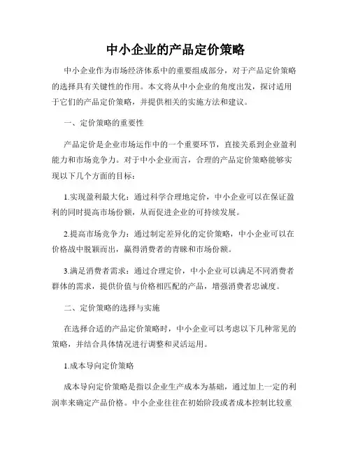 中小企业的产品定价策略中小企业作为市场经济体系中的重要组成部分,对于产品定价策略的选择具有关键性的作用。