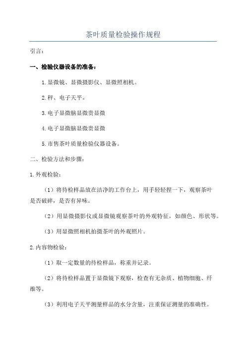 三、显微镜检查法显微镜检查法是一种直接观察茶叶细微结构的方法,通过放大茶叶的细胞、细胞排列和微小结构,可以检测茶叶中可能存在的细微杂质。