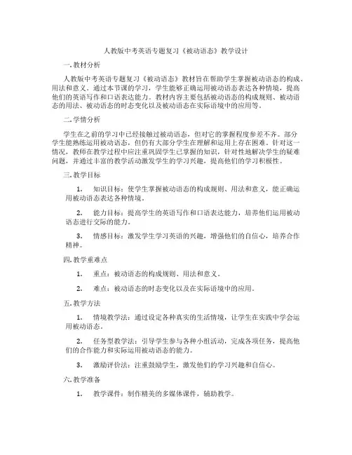 中考英语语法被动语态教案一、教学目标1. 让学生理解被动语态的概念和用法。