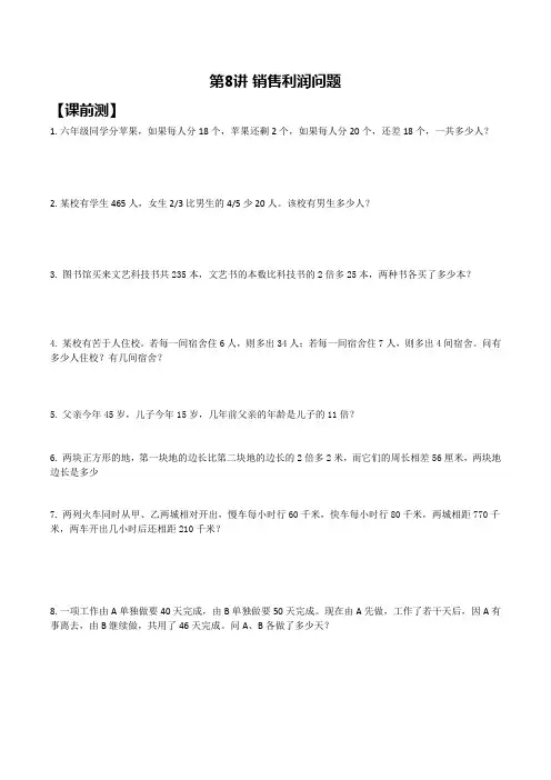第8讲销售利润问题【课前测】1.六年级同学分苹果,如果每人分18个,苹果还剩2个,如果每人分20个,还差18个,一共多少人?2.某校有学生465人,女生2/3比男生的4/5少20人。