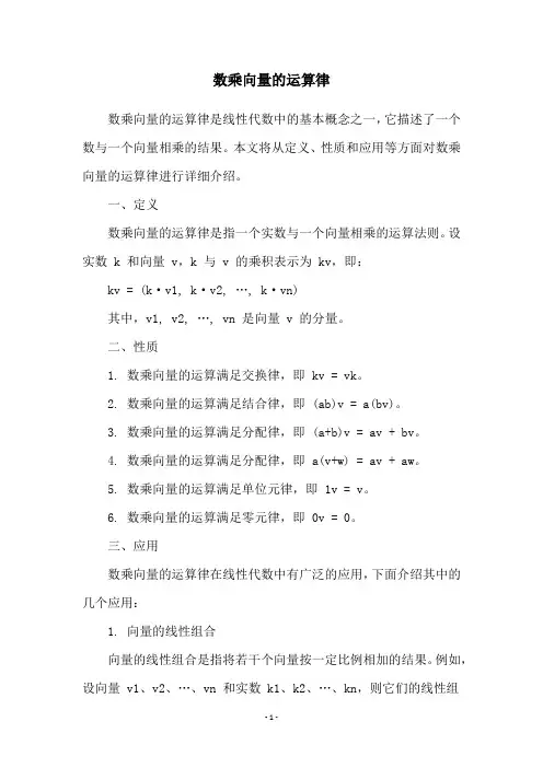 三、应用数乘向量的运算律在线性代数中有广泛的应用,下面介绍其中的几个应用:1. 向量的线性组合向量的线性组合是指将若干个向量按一定比例相加的结果。