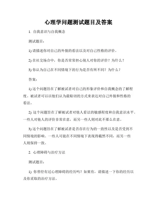 心理学问题测试题目及答案1. 自我意识与自我概念测试题目:1) 请描述你对自己的外貌的看法以及对自己性格的评价。