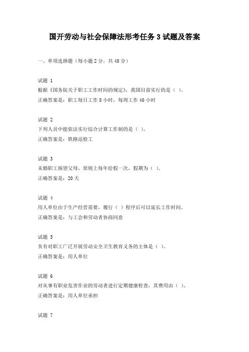 国开劳动与社会保障法形考任务3试题及答案一、单项选择题(每小题2分,共40分)试题 1根据《国务院关于职工工作时间的规定》,我国目前实行的是()。