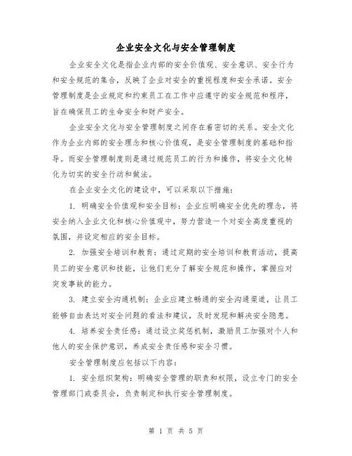 四、企业安全文化的建设与实施1. 安全文化理念的确立:企业要明确安全文化的重要性和必要性,确立安全文化的理念和目标,形成顶层设计和战略规划。