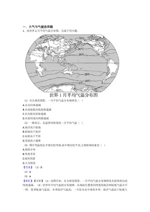 一、天气与气候选择题1.读世界1月平均气温分布图,完成下列小题。