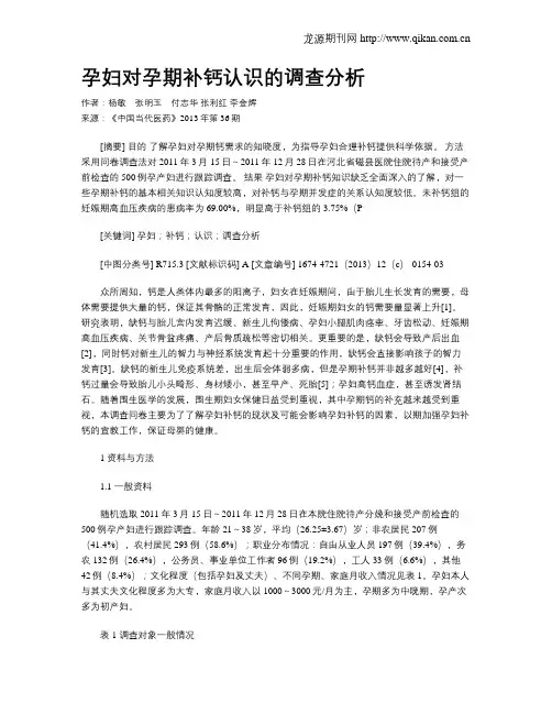 孕妇对孕期补钙认识的调查分析作者:杨敏张明玉付志华张利红李金辉来源:《中国当代医药》2013年第36期[摘要] 目的了解孕妇对孕期钙需求的知晓度,为指导孕妇合理补钙提供科学依据。
