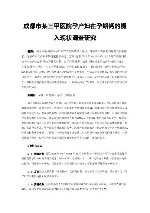 成都市某三甲医院孕产妇在孕期钙的摄入现状调查研究摘要:目的调查成都市孕产妇在孕期钙的摄入现状,分析其中存在的问题及其影响因素,为孕产妇饮食和母婴健康提供参考。