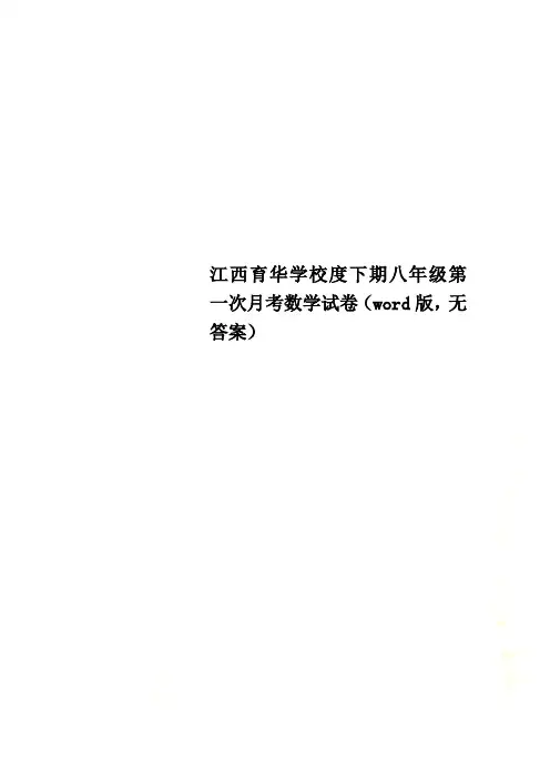江西育华学校八年级数学月考试卷一、选择题(本大题共8小题,每小题3分,共24 分,在每小题给出的四个选项中只有一个答案是正确的)1.下列变形中,正确的是() A. 632322=⨯=)( B. 52)52(-=- C. 169169+=+ D. 494-9-⨯=⨯)()( 2.若等边△ABC 的边长为2cm.那么△ABC 的面积为( ) A.3cm 2 B. 22cmC.23cmD.24cm3.下列各式中能与2合并的是() A. 4 B. 12 C.21 D.2a 4.若顺次连接四边形ABCD 四边的中点,得到的图形是一个矩形,则四边形 ABCD 一定是( )A. 矩形B.菱形C.对角线相等的四边形D.对角线互相垂直的四边形5.如图,点C 的表示的数为2, BC=1,以O 为圆心,OB 为半径画弧,交数轴于点A,则点 A 表示的数是( ) A. 3 B. 5 C.3- D.5-第5题第6题 第8题6.如图,四边形BCD 是菱形,点E 、F 分别在BC 、CD 上,且△AEF 是等边三角形,AB=AE ,则∠B=()A. 65°B. 70°C.75°D.80°7.△ABC 中,AB=15,AC=13,高AD=12,则△4BC 的周长为()A. 42B. 32C.42或32D.37或338.在四边形ABCD 中,AD ∥BC ,∠ABC=90°,AB=BC ,E 为AB 边上一点,∠BCE=15°,且AE=AD 、连接 DE 交对角线AC 于H ,连接 BH.下列论∶①△ACD ≌△ACE ;②△CDE 为等边三角形;③226+=BE EH ;④CHAH S S EHC EBC =∆∆. 其中结论正确的是()A. ①②B. ①②③④C. ③④D. ①②④二、填空题(本大题共 6小题,每小题3分,共18 分) 9.2x -1是二次根式.则x 的取值范围是_______10.己知直角三角形的丙条边长为6,8,那么斜边上的中线长是________ 11.n 24是整数,则正整数n 的最小值是________12.已知A(0, 1),B(3, 2),点P 为x 轴上任意一点,则PA+PB 的最小值为_____13.如图,有两个全等矩形纸条,长与宽分别是8 和6,按图所示交又叠放在一起,则重合部分的面积为________14.如图,在矩形ABCD 中,AB=4, AD=8,延长 BC 至点E ,使CE=3,连接 DE 得到四边形ABED, 动点P 从点B 出发,以每秒2个单位的速度沿BC —CD 向终点D 运动,设点P 运动的时间为t 秒(P >0)时,点P 到四边形ABED 相邻两边距离相等,则t=_______三、解答题(本大题共4小题,每小题6 分,共 24 分)15. 计算(1)18-2-218102-)(+;(2))()(3113-32-54-48+⨯+.16.如图,四边形ABCD 是平行四边形,延长 BA 至点E,使AE+CD=AD,连接CE,求证∶ CE 平分∠BCD.17.如图,已知四边形ABCD为菱形,对角线AC与 BD相交于点O,E为AO上一点,过点E作EF⊥AC,请仅用无刻度的直尺,分别按下列要求画图(保留画图痕迹).(1)在图1中,EF交AD于点F,西出线段EF关于BD的对称线段 EF;(2)在图2中,点F在AD外时,画出线段EF关于 BD的对称线段EF.I8.某地要开发一块三角形植物园,如图,测得 AC=80m,BC=60m,AB=100m.(1)若入口E在边AB上,且AB=2BE.求从入口E到出口C的路线的长;(2)若线段 CD是一条水渠,且点D在边AB上,已知水渠造价为100元/m,则点D在距离B 多远处,此水渠造价最低,并求出水渠CD的最低总造价.四、解答题(本大题共3 小题,每小趣8 分,共24 分)19.如图,矩形.4BCD中,点E在边CD上,将△BCE沿BE折叠,点C落在AD边上的点F处,过点F作 FG∥CD交BE于点G.连接 CG.(1)请判断四边形CEFG 的形状,并说明理由;(2)若AB=6,AD=10,求四边形 CEFG 的面积.20.如图,在△ABC中,点D是边BC的中点,点E在△4BC内,AE平分∠BAC,CE⊥AE,点F 在边AB上,EF∥BC.(1)求证:四边形 BDEF是平行四边形;(2)线段 BF,AB,AC的数量之间具有怎样的关系?证明你所得到的结论.21.如图1,我们把对角线相互垂直的四边形叫做垂美四边形.(1)概念理解,在四边形ABCD中,以下是垂美四边形的是______①平行四形; ②矩形; ③菱形;④AB=AD,CB=CD.(2)性质探究,小美同学精想“垂美四边形两组对边的平方和相等”,即,如图1,在四边形ABCD中,若AC⊥BD,则AB2+CD2=AD2+BC.2请判断小美同学的猜想是否正确,并说明理由.(3)间题解决:如图2.在△ABC中,BC=3,AC=4,D、E分别是AC、BC的中点,连接AE、BD. 有AE⊥BD,求AB.五、解答题(本大题共小题,共10 分)22.在矩形ABCD中,AB=6.AD=8.E是边BC上一点,以点E为直角顶点,在LE的右侧作等腰直角△人EF.(1)如图1,当点F在CD边上时,求 BE的长;(2)如图2,若EF⊥DF,求BE 的长;(3)如图3,若动点E从点B出发,沿边BC向右运动,运动到点C停止,直接写出点F的运动路径长.。