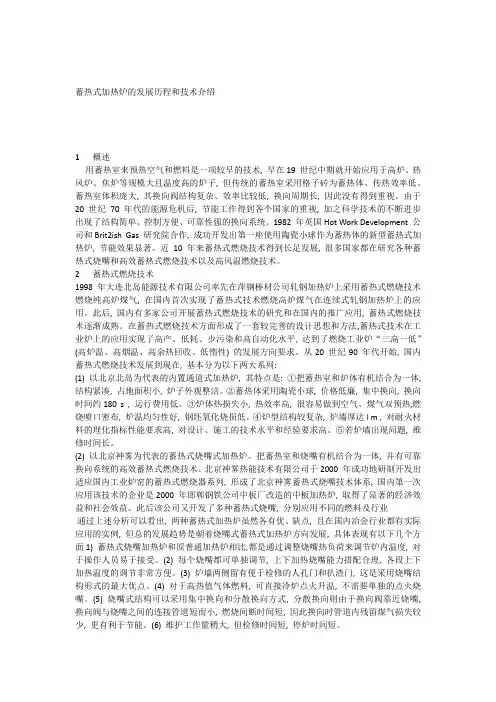 蓄热式燃烧技术在加热炉中的应用一、引言蓄热式燃烧技术自20世纪90年代从国外引进到国内,被广泛应用于钢铁行业,特别是在轧钢加热炉的应用上,通过不断消化吸收和创新改进,在节能减排方面取得了突出的成效。