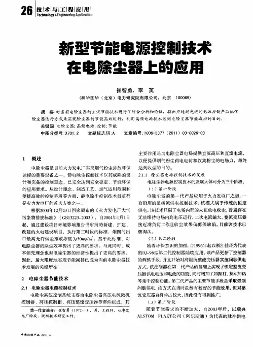 关键词:电除尘器;电源系统;节能1电除尘电源应用现状随着环保要求的提高,燃煤电厂电除尘器正面临着新的挑战和机遇。