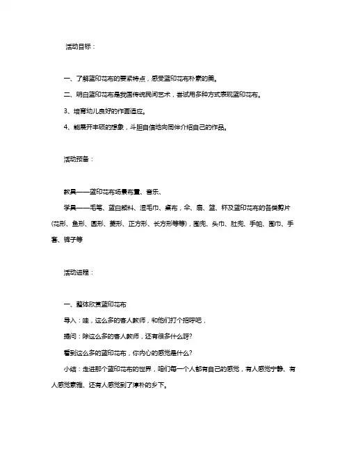活动准备:教具——蓝印花布场景布置、音乐、学具——毛笔、蓝白颜料、湿毛巾、桌布,伞、扇、篮、杯及蓝印花布的各种剪片(花形、鱼形、圆形、菱形、正方形、长方形等等),围兜、头巾、肚兜、手帕、围巾、手套、裤子等活动过程:一、整体欣赏蓝印花布导入:哇,这么多的客人老师,和他们打个招呼吧,提问:除了这么多的客人老师,还有很多什么呀?看到这么多的蓝印花布,你心里的感觉是什么?小结:走进这个蓝印花布的世界,我们每个人都有自己的感觉,有人感觉宁静、有人感觉素雅、还有人觉得到了淳朴的乡下。