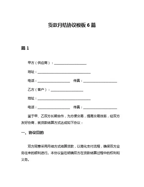 货款月结协议模板6篇篇1甲方(供应商):______________________地址:____________________________________电话:______________________ 传真:_______________________乙方(客户):______________________地址:____________________________________电话:______________________ 传真:_______________________鉴于甲、乙双方长期合作,为方便交易,提高交易效率,经双方友好协商,就货款结算方式达成如下协议:一、协议目的双方同意采用月结方式结算货款,以简化支付流程,确保双方业务往来的顺利进行。