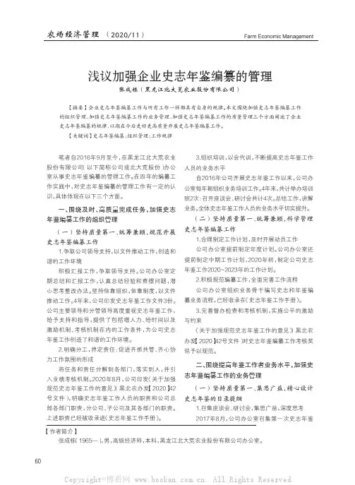 浅议加强企业史志年鉴编纂的管理张成栋(黑龙江北大荒农业股份有限公司)【摘要】 企业史志年鉴编纂工作与所有工作一样都具有自身的规律。