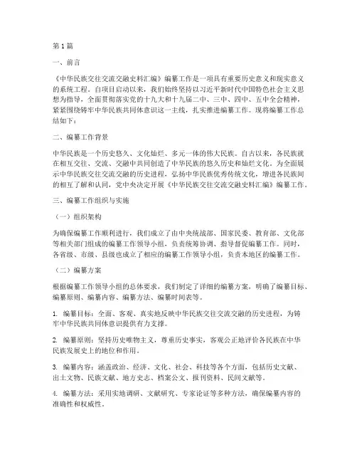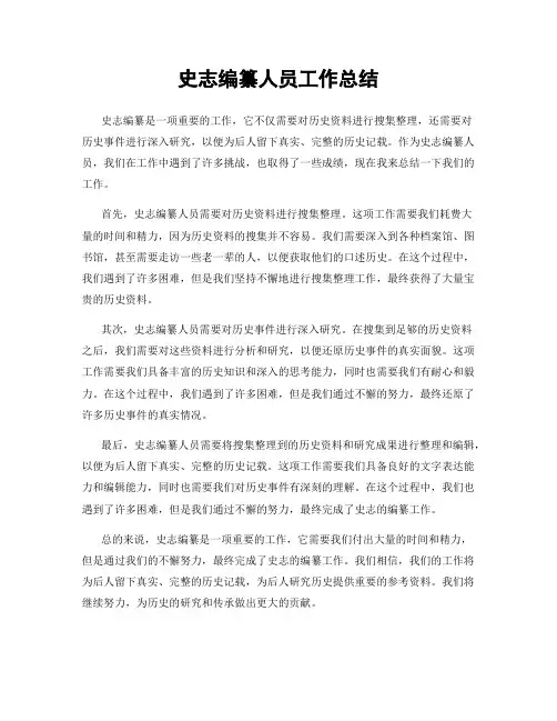 史志编纂人员工作总结史志编纂是一项重要的工作,它不仅需要对历史资料进行搜集整理,还需要对历史事件进行深入研究,以便为后人留下真实、完整的历史记载。