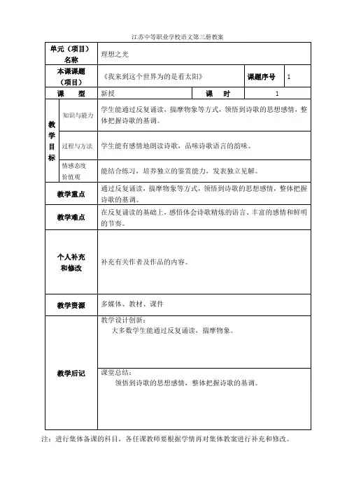 江苏中等职业学校语文第三册教案注:进行集体备课的科目,各任课教师要根据学情再对集体教案进行补充和修改。