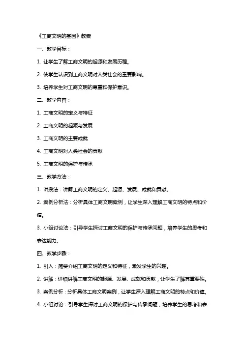 三、教学方法1. 讲授法:讲解工商文明的起源、发展、核心基因等基本概念。