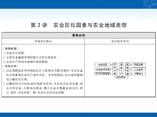 [基础知识梳理]一、影响农业的区位因素1.自然条件光照光照长短、强弱的地区分布,在很大程度上决定着农作物的地区分布热量制约农作物产量,关系到农作物种类、耕作制度和栽培方法土地最基本的农业生产资料水分是绿色植物进行光合作用不可缺少的原料,为动植物生存、生长输送营养物质,还影响到农业地域类型2.农业技术经济因素劳动力各种农业生产对于劳动力的要求是不同的,就种植业来说,经济作物对于劳动力的需求要大于粮食作物,种植水稻的劳动力需求大于种植小麦技术装备提高农业劳动生产率,使劳动力不断地从农业生产中解放出来,有助于加强农业的专业化进程生产技术涉及良种培育、耕作技术、作物栽培、水肥控制、病虫害防治等种植方式单作、间作、套作、混作、连作等耕作制度又称熟制,比如一年一熟、两年三熟、一年两熟、三年五熟等3.农业社会经济因素:主要包括市场、交通运输和农产品消费状况等。
