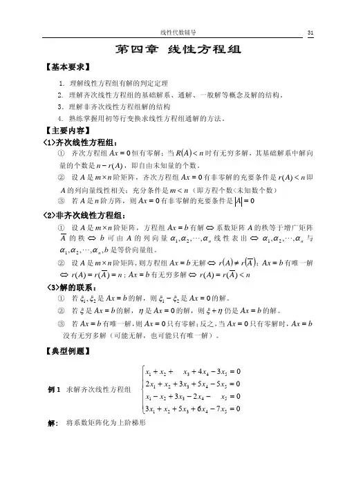 第四章 线性方程组1.线性方程组的基本概念(1)线性方程组的一般形式为:其中未知数的个数n 和方程式的个数m 不必相等. 线性方程组的解是一个n 维向量(k 1,k 2, …,k n )(称为解向量),它满足当每个方程中的未知数x 用k i 替代时都成为等式. 线性方程组的解的情况有三种:无解,唯一解,无穷多解.对线性方程组讨论的主要问题两个:(1)判断解的情况.(2)求解,特别是在有无穷多接时求通解. b 1=b 2=…=b m =0的线性方程组称为齐次线性方程组. n 维零向量总是齐次线性方程组的解,称为零解.因此齐次线性方程组解的情况只有两种:唯一解(即只有零解)和无穷多解(即有非零解). 把一个非齐次线性方程组的每个方程的常数项都换成0,所得到的齐次线性方程组称为原方程组的导出齐次线性方程组,简称导出组. (2) 线性方程组的其他形式 线性方程组除了通常的写法外,还常用两种简化形式: 向量式 x 1α1+x 2α2+…+n x n α= β, (齐次方程组x 1α1+x 2α2+…+n x n α=0).即[]n a a ,,a 21 ⎥⎥⎥⎥⎦⎤⎢⎢⎢⎢⎣⎡n x x x 21=β 全部按列分块,其中β,,21n a a a 如下⎥⎥⎥⎥⎦⎤⎢⎢⎢⎢⎣⎡=121111m a a a α ,⎥⎥⎥⎥⎦⎤⎢⎢⎢⎢⎣⎡=222122m a a a α,………,⎥⎥⎥⎥⎦⎤⎢⎢⎢⎢⎣⎡=mn n n n a a a 21α, ⎥⎥⎥⎥⎦⎤⎢⎢⎢⎢⎣⎡=m b b b 21β 显然方程组有解的充要条件是向量β可由向量组n ααα,,21 线性表示。