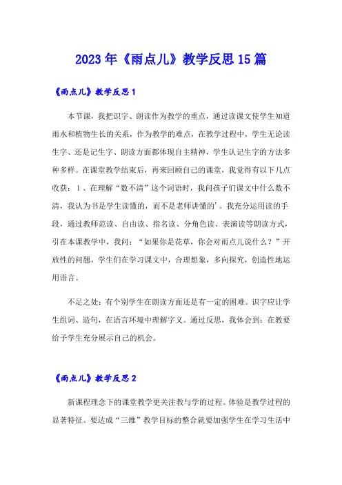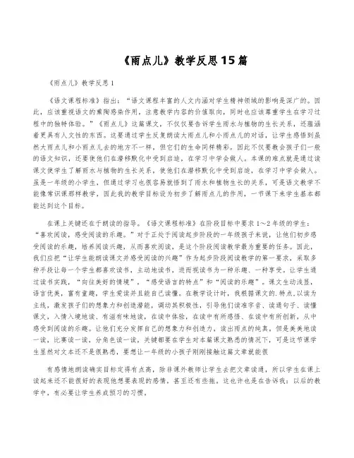 《雨点儿》教学反思15篇《雨点儿》教学反思1本节课,我把识字、朗读作为教学的重点,通过读课文使学生知道雨水和植物生长的关系,作为教学的难点,在教学过程中,学生无论读生字、还是记生字、朗读方面都体现自主精神,学生认记生字的方法多种多样。