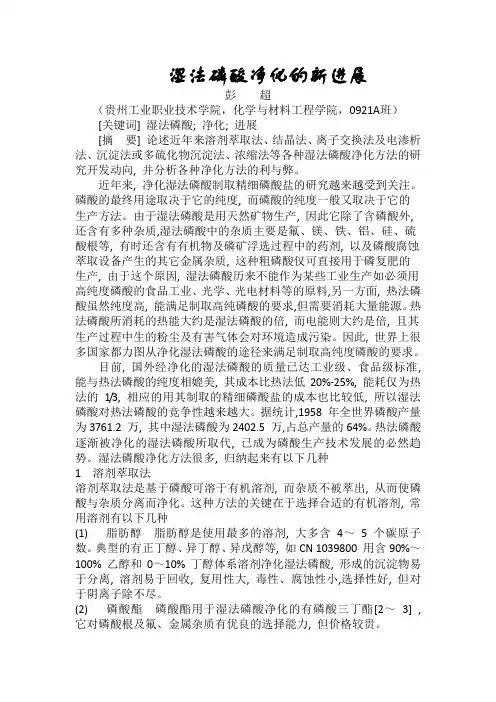 湿法磷酸净化的新进展彭超(贵州工业职业技术学院,化学与材料工程学院,0921A班)[关键词] 湿法磷酸; 净化; 进展[摘要] 论述近年来溶剂萃取法、结晶法、离子交换法及电渗析法、沉淀法或多硫化物沉淀法、浓缩法等各种湿法磷酸净化方法的研究开发动向, 并分析各种净化方法的利与弊。