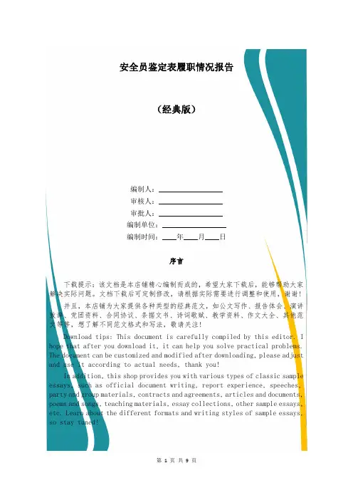 安全员鉴定表履职情况报告(经典版)编制人:__________________审核人:__________________审批人:__________________编制单位:__________________编制时间:____年____月____日序言下载提示:该文档是本店铺精心编制而成的,希望大家下载后,能够帮助大家解决实际问题。